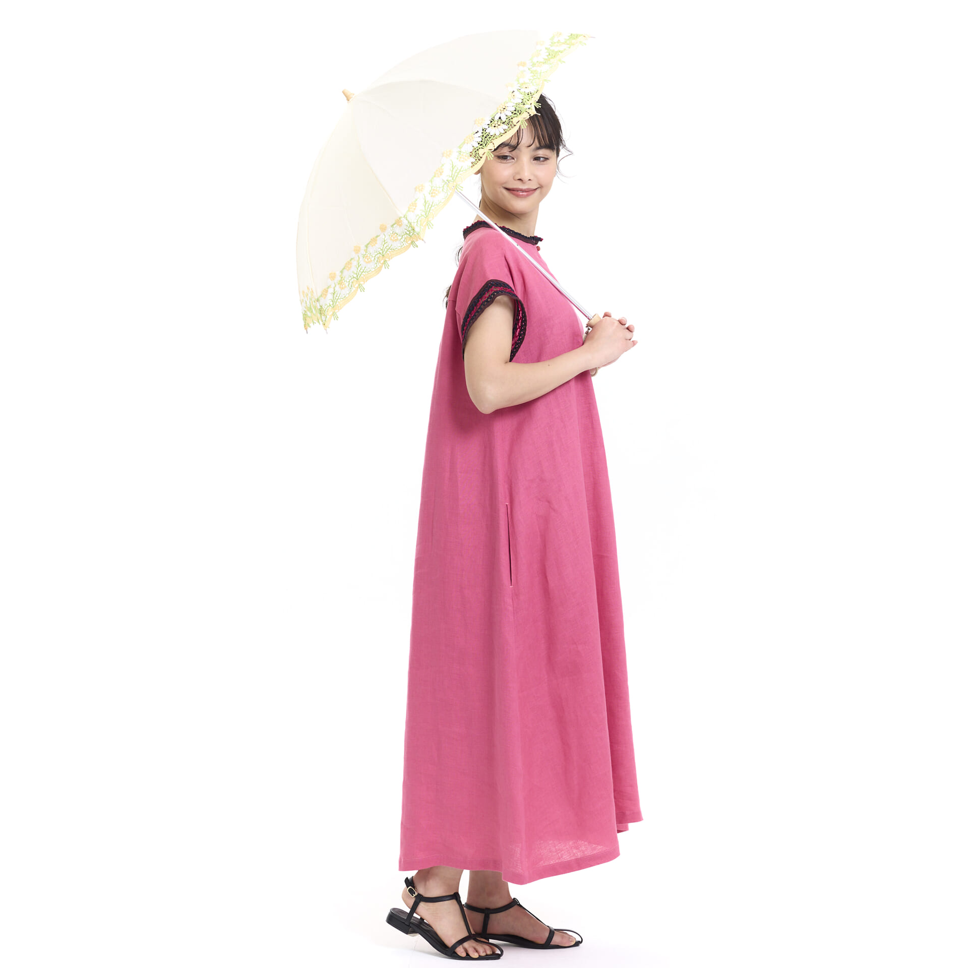 優れた通気性とUVカット効果を持つ「麻」と、実用品を豪華にエレガントにスタイルアップするレースをあしらった、他にはない近沢レース店ならではのパラソル。人気の「カモミールレース」を日傘用にアレンジし、素敵な日傘が完成いたしました。