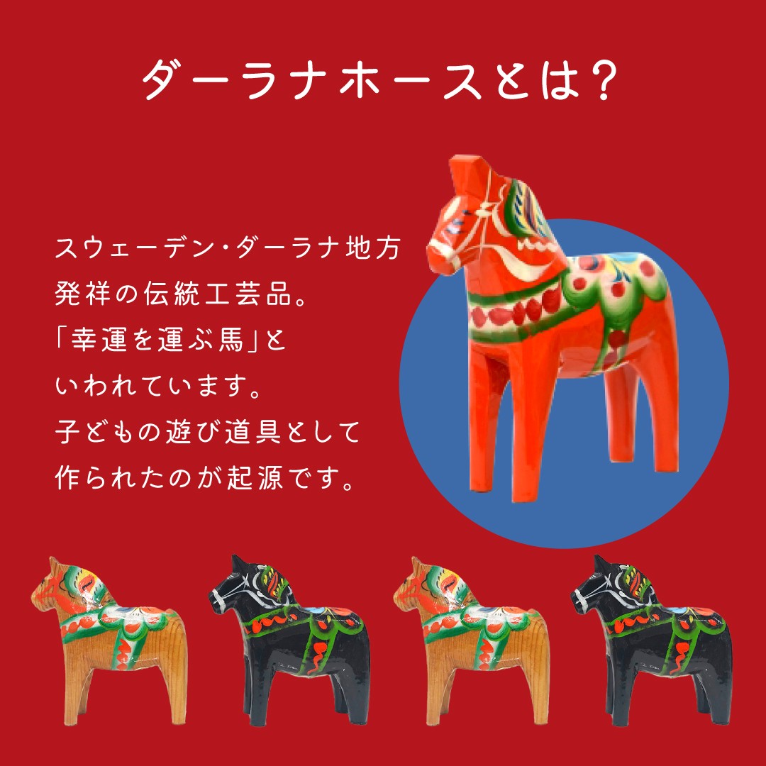 ダーラナホースは、スウェーデンのダーラナ地方に伝わる伝統工芸品である木彫りの馬の置物です。スウェーデン語では「Dalahäst(ダーラヘスト)」と呼ばれ、「幸せを呼ぶ馬」としても知られています。木こりが子どもたちのおもちゃとして作ったのが起源で、次第にスウェーデンのシンボルとして世界中で愛されるようになりました。
