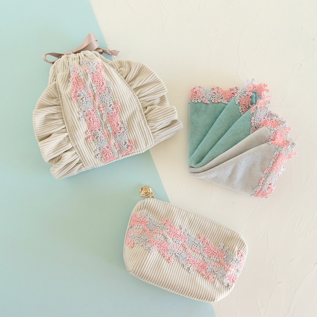 今回は巾着とポーチ、それぞれ2色ずつご用意いたしました。