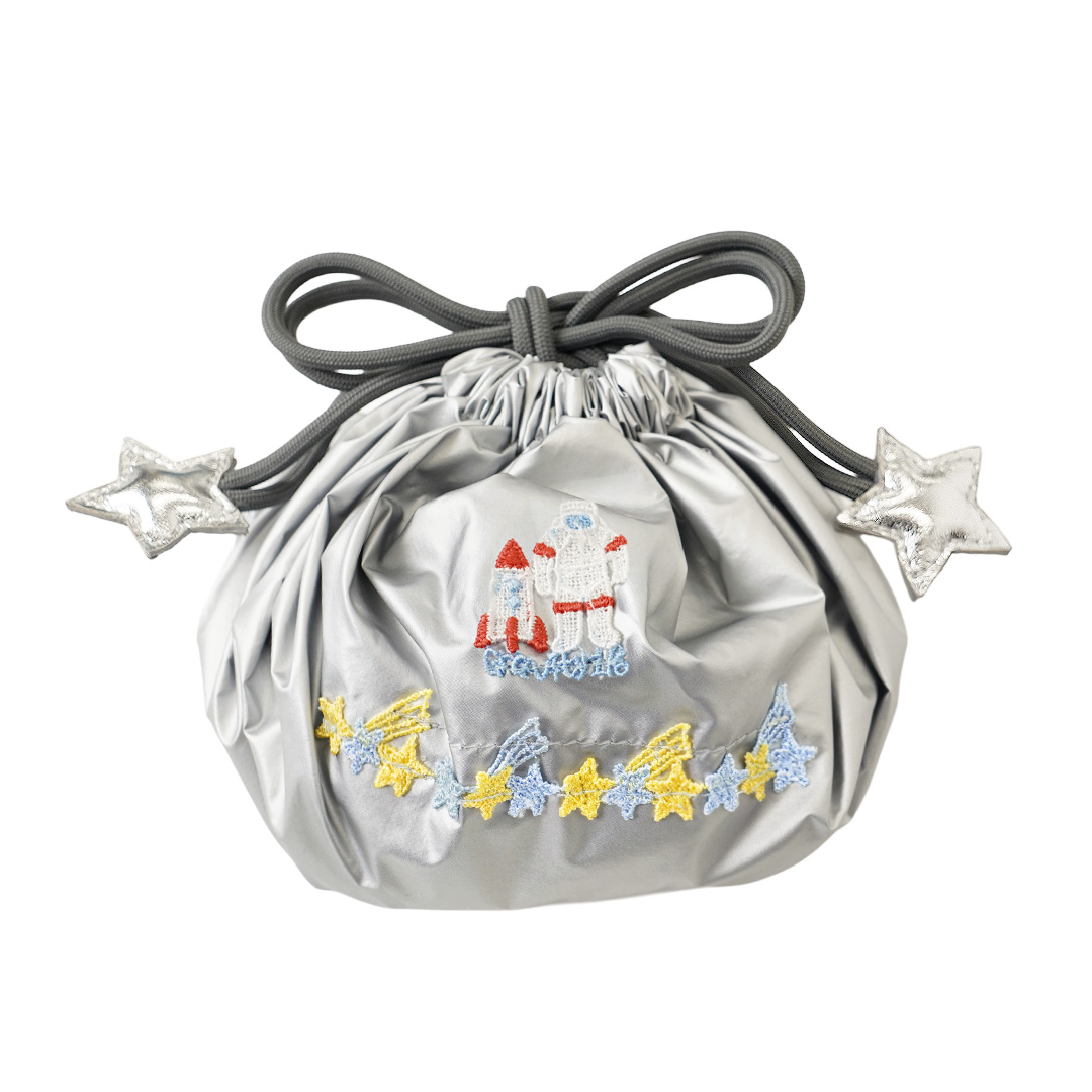 26ss新作の「月で待ち合わせ」レースがあしらわれた小物が新登場! メタリックな生地や合皮素材、ファスナーには星柄のプリントを施し、月や宇宙空間を思わせる、丸や星のカタチでアイテムを揃えました。 スペース感満載な楽しい小物シリーズです。