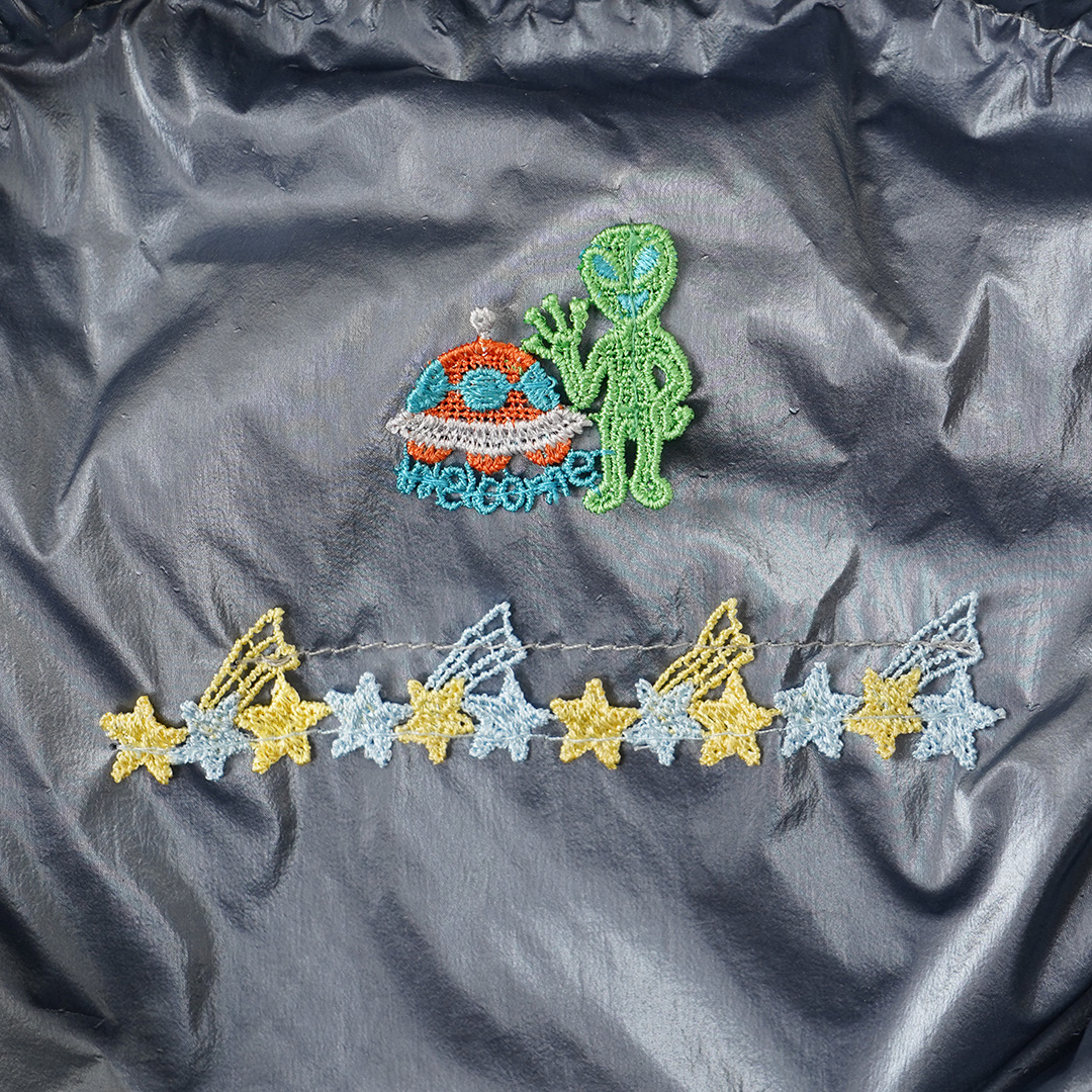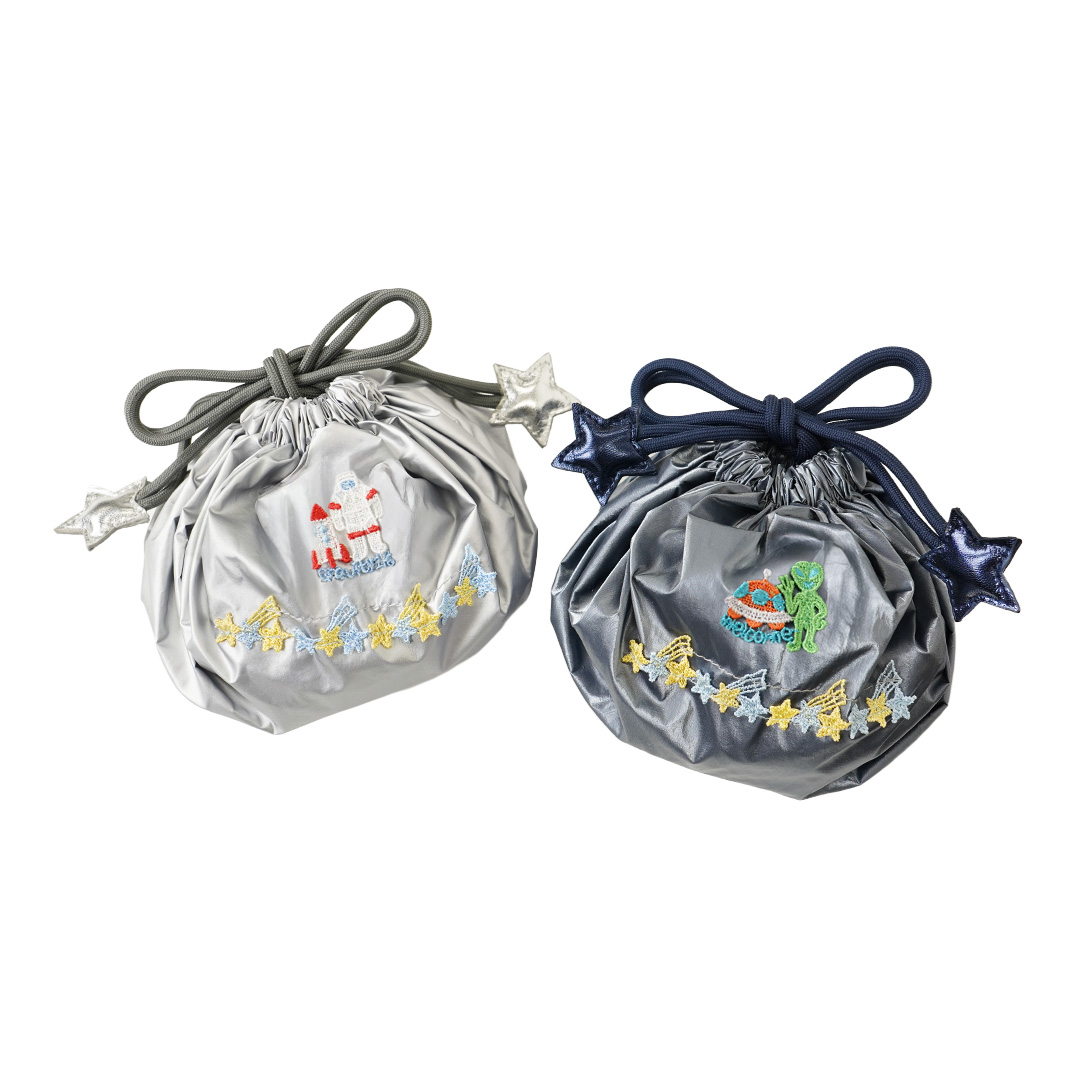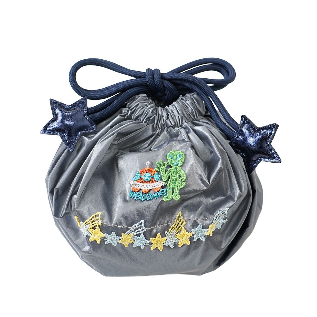 メタリックな生地や合皮素材、ファスナーには星柄のプリントを施し、月や宇宙空間を思わせる、丸や星のカタチでアイテムを揃えました。