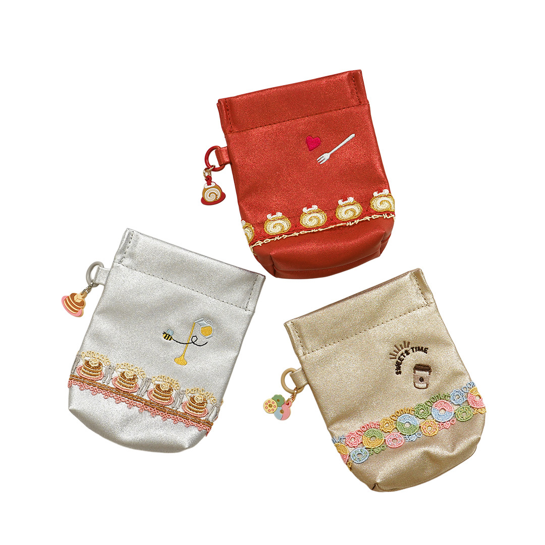 「パンケーキ」「ドーナツ」「ロールケーキ」のスイーツにまつわるレースばかりを集めた合皮の小物シリーズです。 きらっと輝くシャイニーな素材感・スイーツのラバーストラップ。可愛らしい刺繍、そのどれもが女子心をくすぐるデザイン。