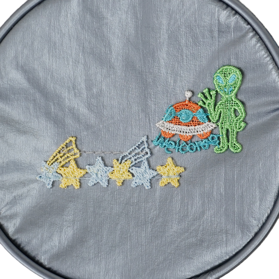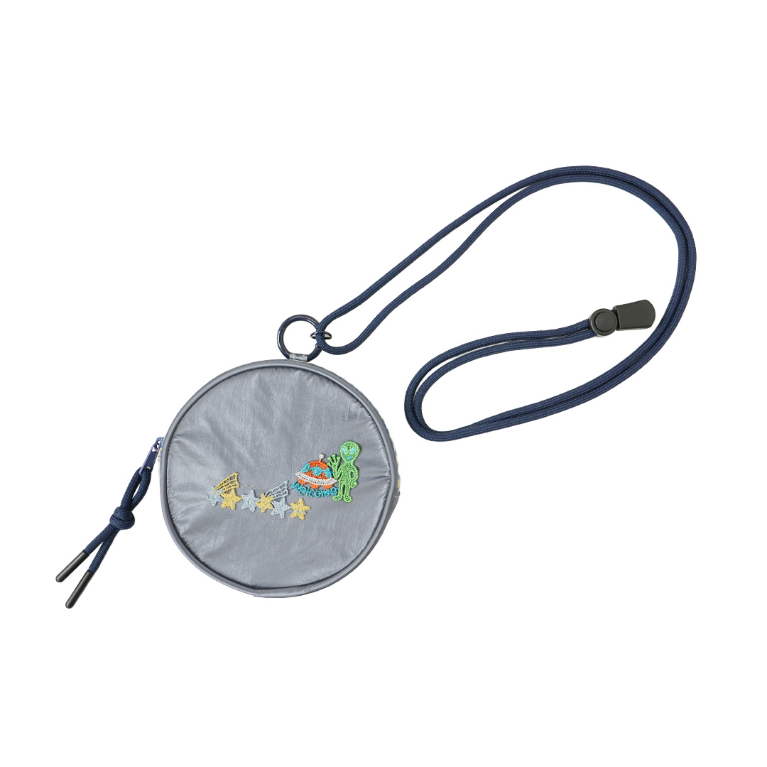 26ss新作の「月で待ち合わせ」レースがあしらわれた小物が新登場! メタリックな生地や合皮素材、ファスナーには星柄のプリントを施し、月や宇宙空間を思わせる、丸や星のカタチでアイテムを揃えました。 スペース感満載な楽しい小物シリーズです。
