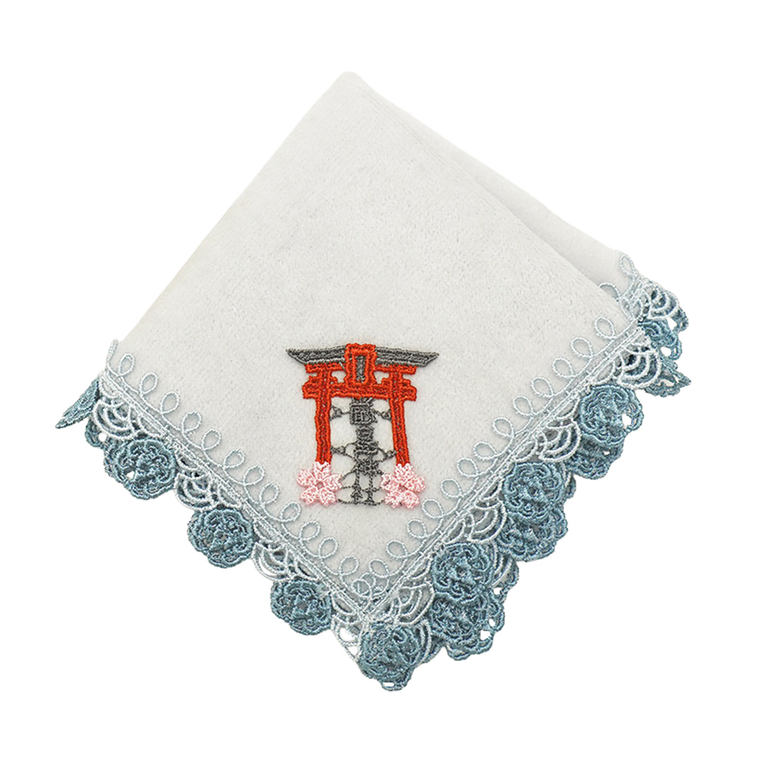 元町厳島神社宮司ご賛同のもと、この度「元町厳島神社×近沢レース店」のコラボレーションが実現。地元の神社を守りたい。そのような思いで、おつくりしたタオルハンカチ。近沢レース店では、売り上げの半分を、社殿修繕のため奉納し、その維持・継承を支援いたします。