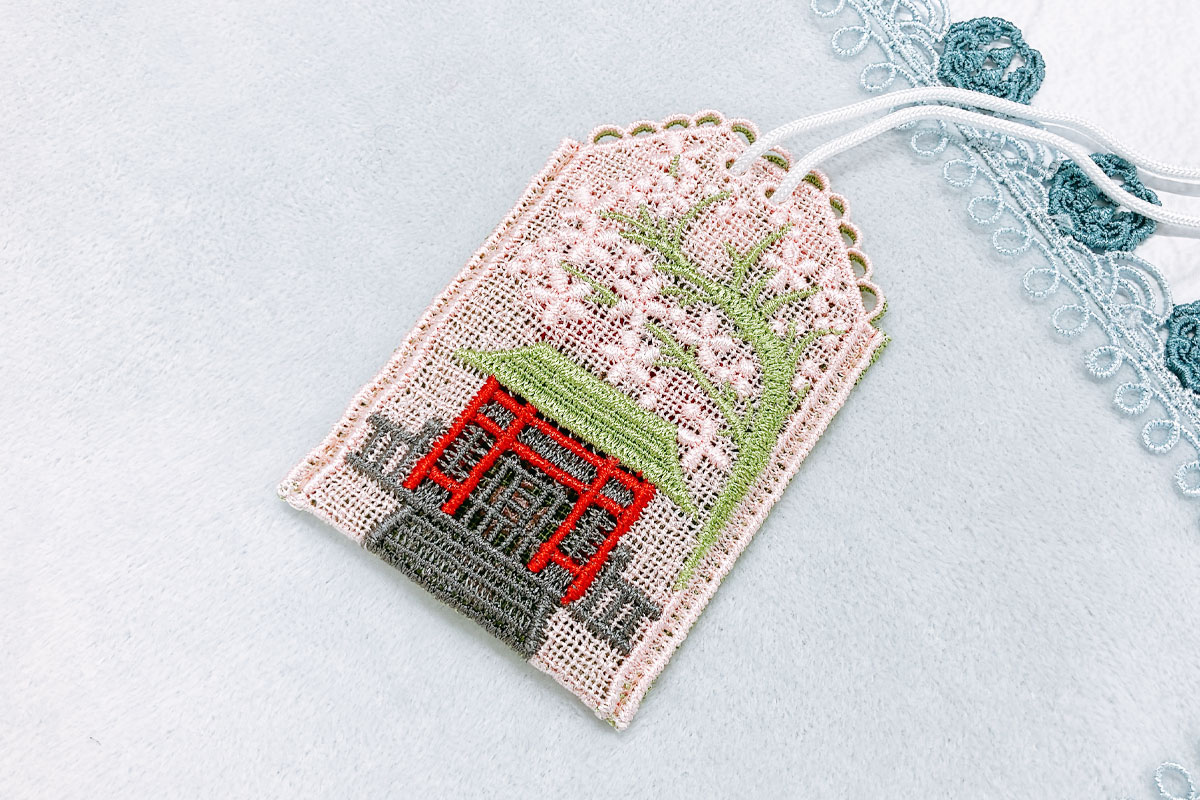 そしてコーナーには、元町厳島神社の「鳥居」のモチーフレース。鳥居の麓には、境内に咲き誇る桜を合わせました。