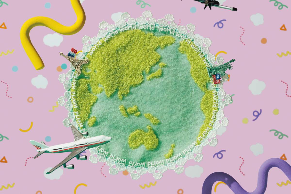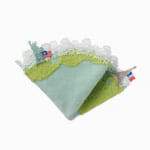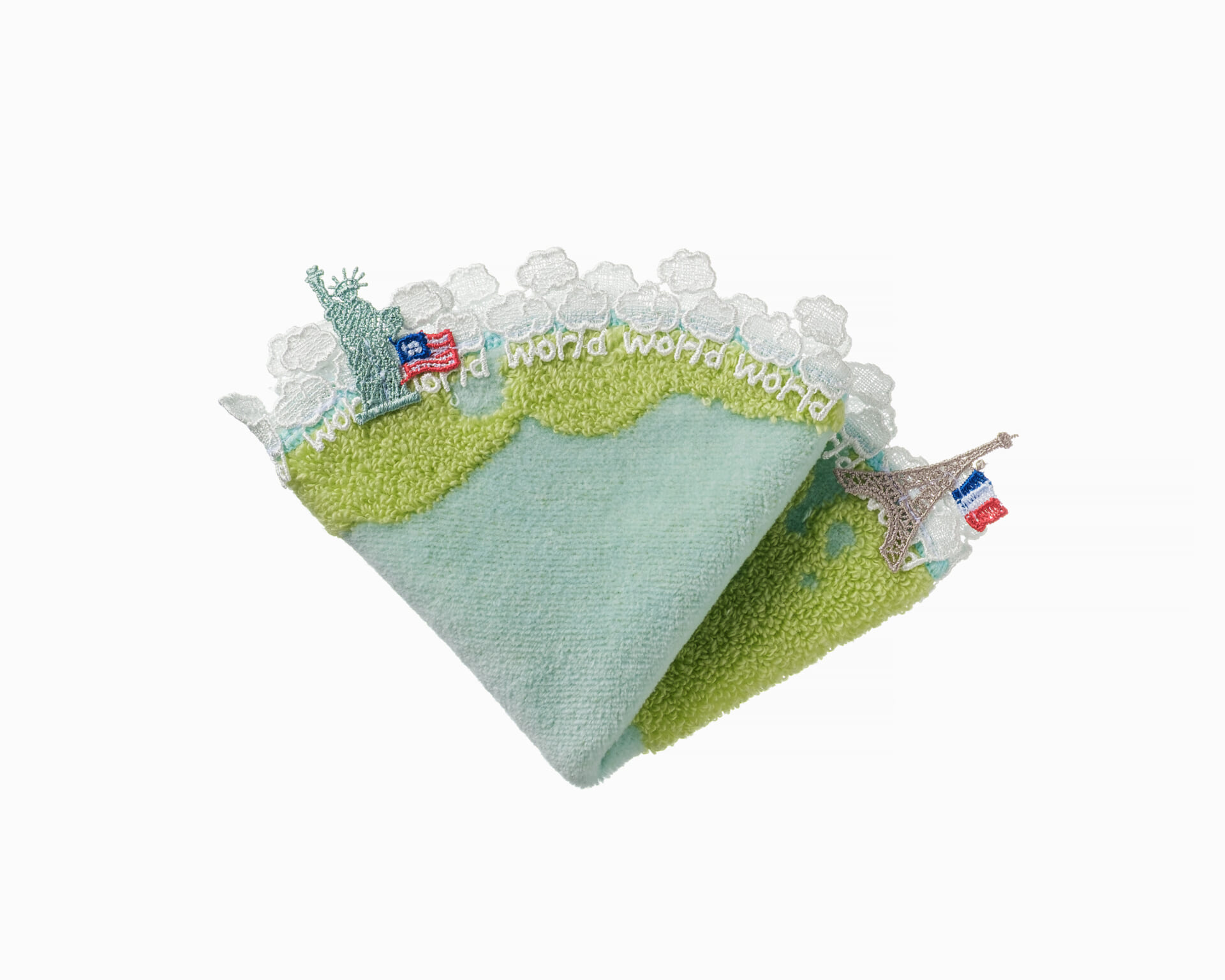 旅に出よう!アメリカはニューヨーク、フランスは花の都パリへ。まるで記事を地球に見立て、worldの文字を施した白い雲レース、自由に女神とエッフェル塔のモチーフレースをつけました。旅心を誘うレースハンカチ、小さな世界旅行をしませんか?