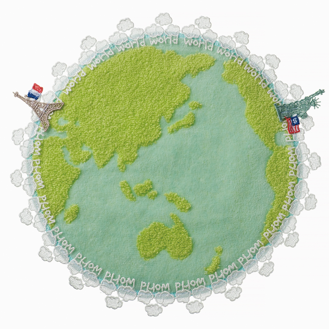 見上げた空はひとつに繋がっていて、同じ空を世界中の人たちが見ている。そんなイメージで、丸いハンカチを地球に見立て、プカプカ浮かぶ白い雲レースにworldの文字を施し、空をつなげてみました。