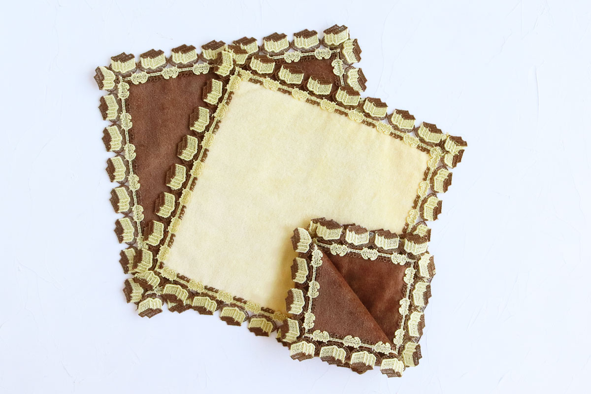 「福砂屋(ふくさや)」さま創業400年記念コラボハンカチ。福砂屋オリジナルのレースには、お皿にのったカステラと「カステラ」の文字、さらに福砂屋の商標として親しまれている蝙蝠(こうもり)が織り込まれています。美味しそうなタオル地にもこだわりました。
