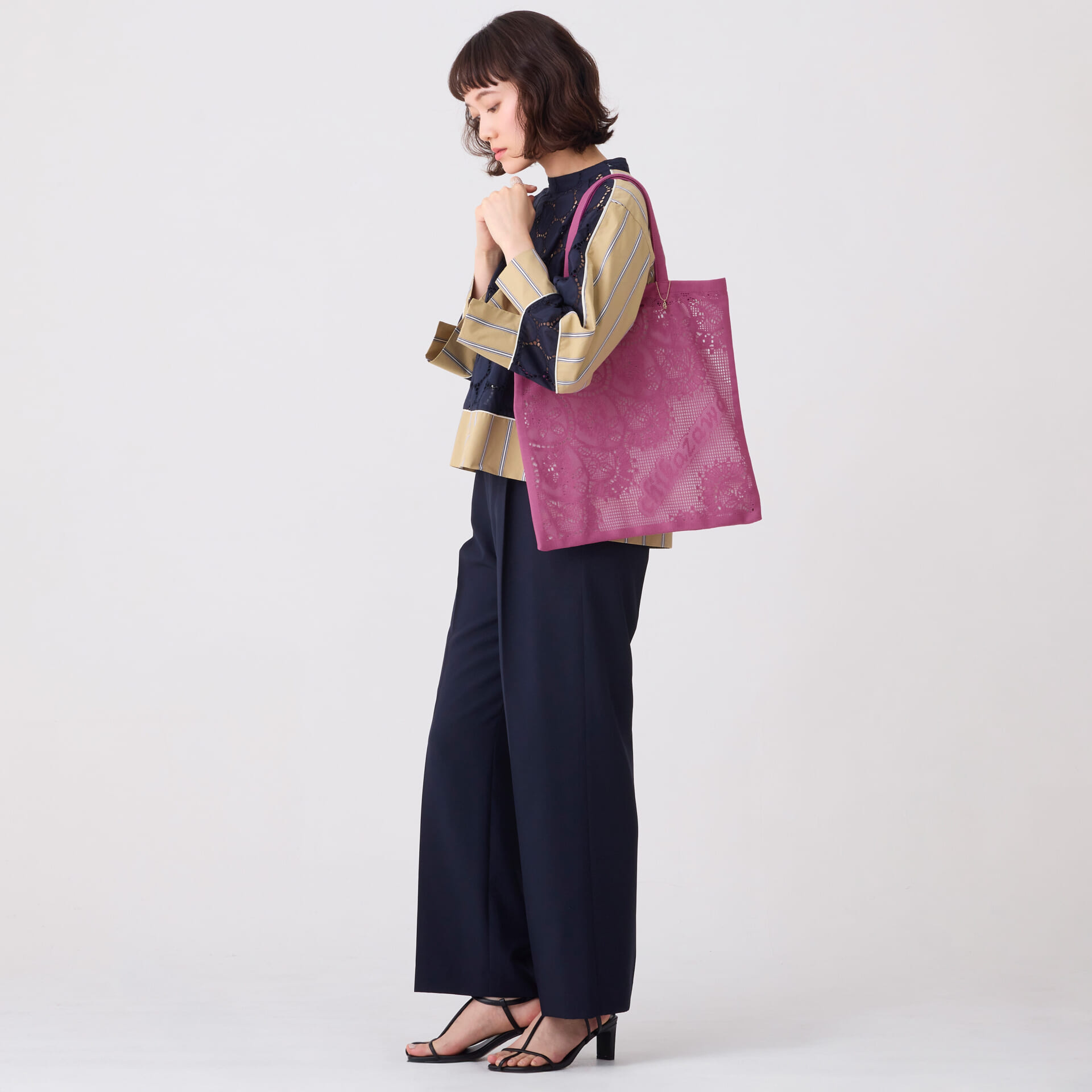 A4サイズも余裕を持って入り、全面レースの一見華奢な見た目ながら耐荷重10kgと丈夫さを兼ね備えたトートです。エコバッグとしても、サブバッグとしても、オケージョンを選びません。