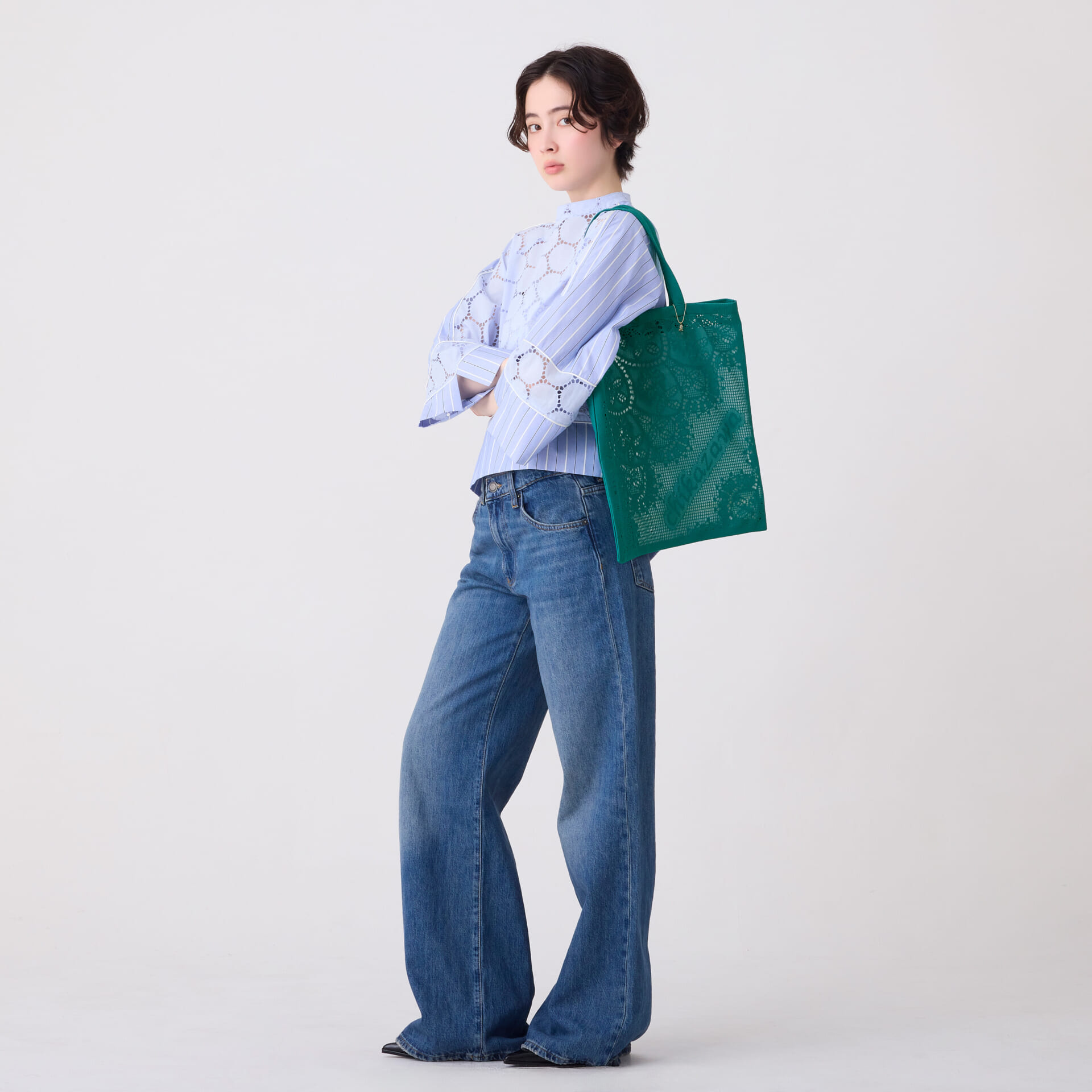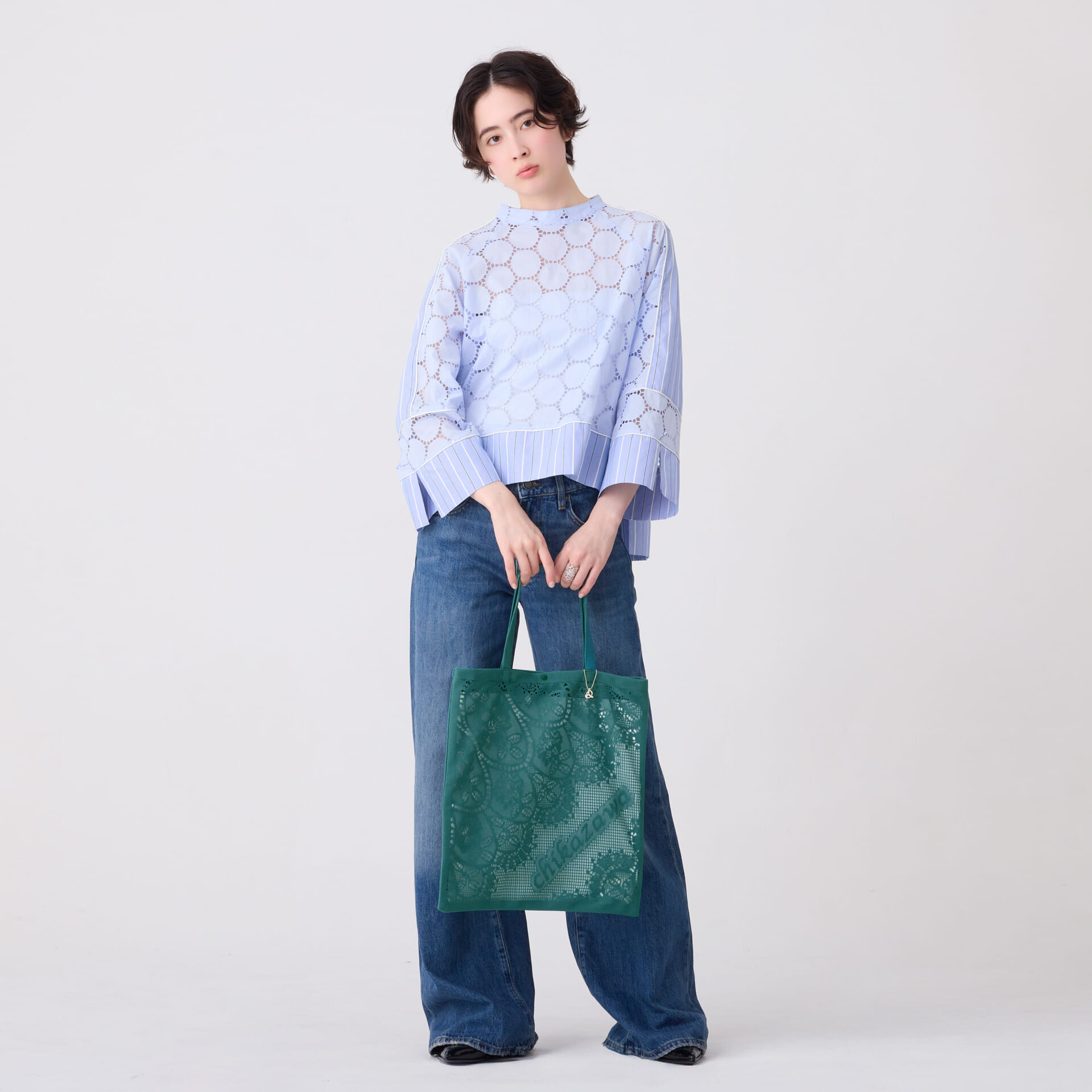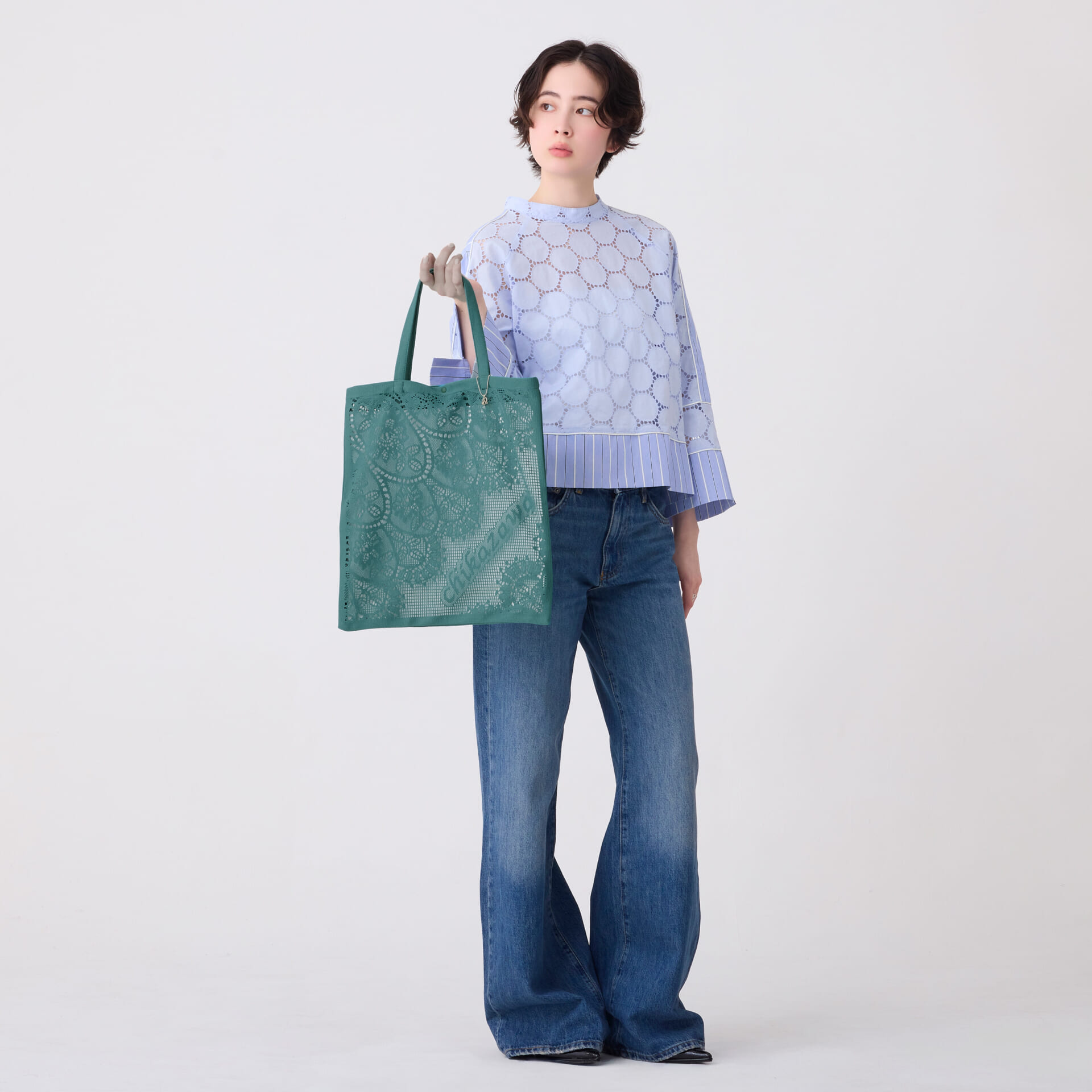 A4サイズも余裕を持って入り、全面レースの一見華奢な見た目ながら耐荷重10kgと丈夫さを兼ね備えたトートです。エコバッグとしても、サブバッグとしても、オケージョンを選びません。