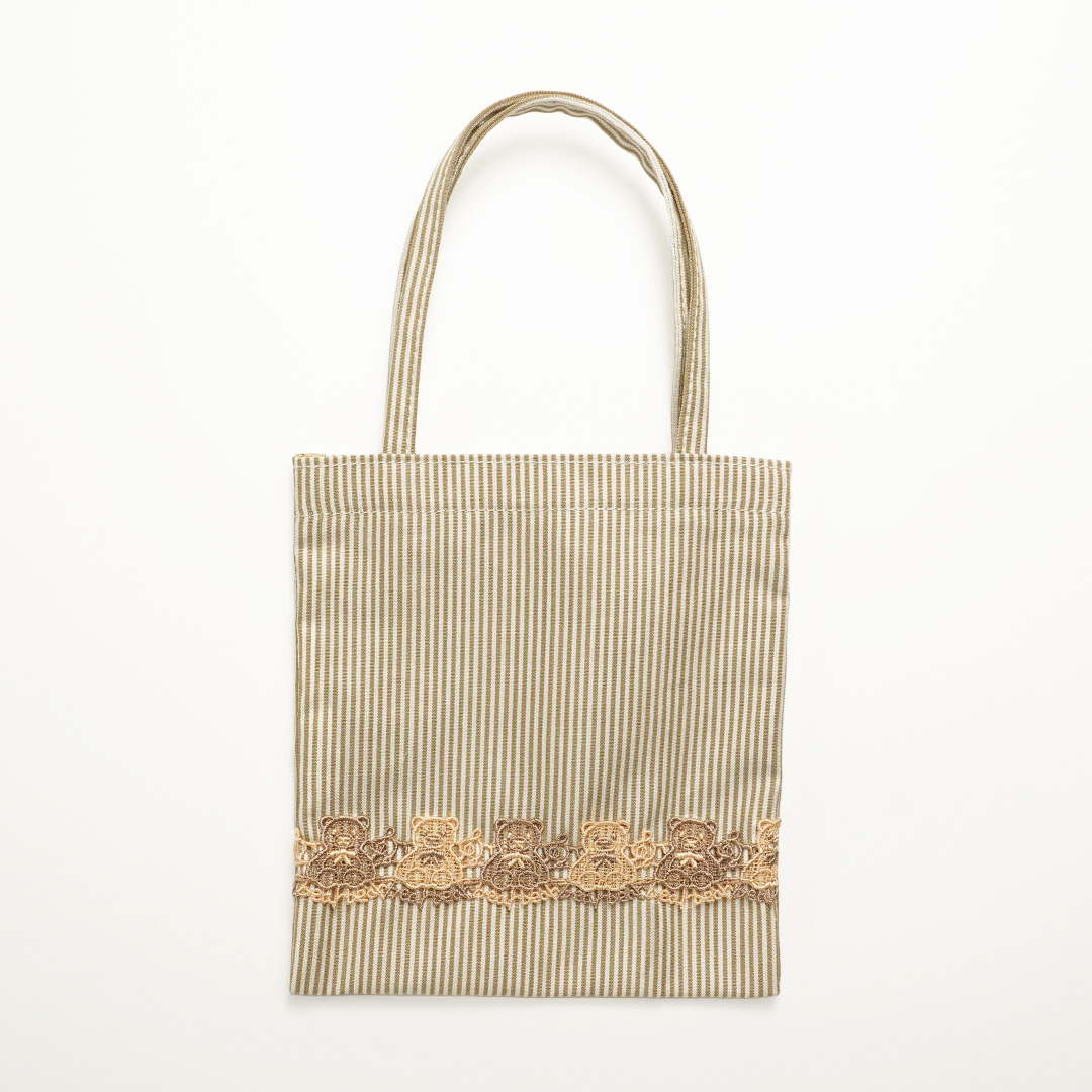 大人気のくまモチーフのレースに、ストライプ柄の生地を組み合わせた、ポップなデザイン。