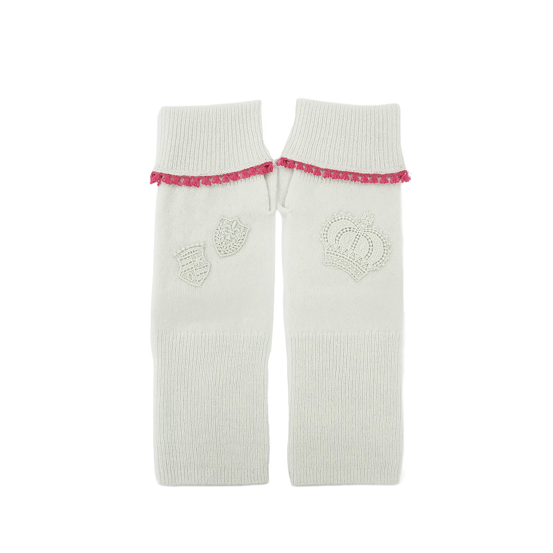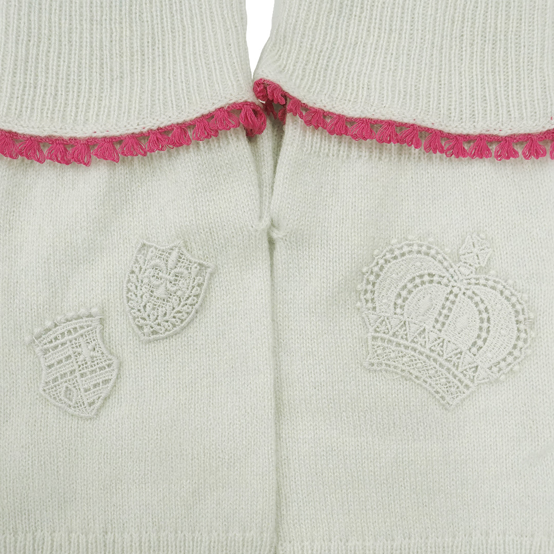 王冠や盾、鳩などの小さなモチーフレースがそれぞれのアイテムに縫製されています。