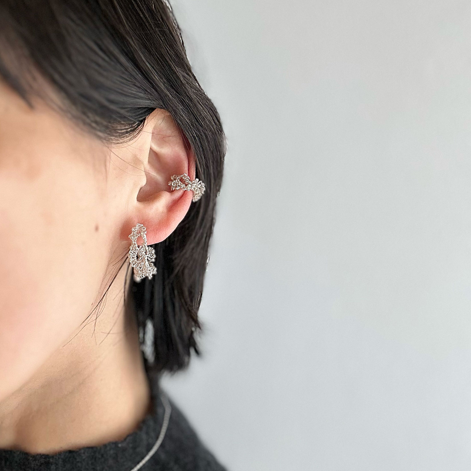 立体的なデザインながら驚くほど軽く、長時間の着用でも負担になりません。髪を耳にかけた時やアップスタイルに映える存在感があり、シンプルなコーディネートにもアクセントとして重宝します。カジュアルにもモードにも、装いの幅を広げてくれる一品です。カラーは落ち着いたシルバーと温もりあるゴールドの2色展開。