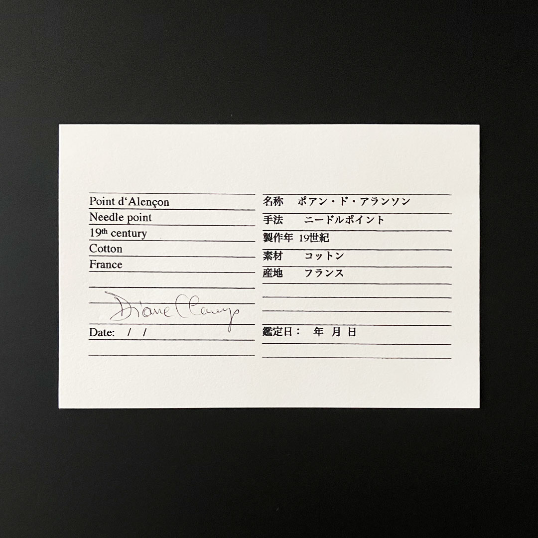 アンティーク・レース鑑定家である、ダイアン・クライス氏による鑑定書を同封してお届けいたします。