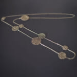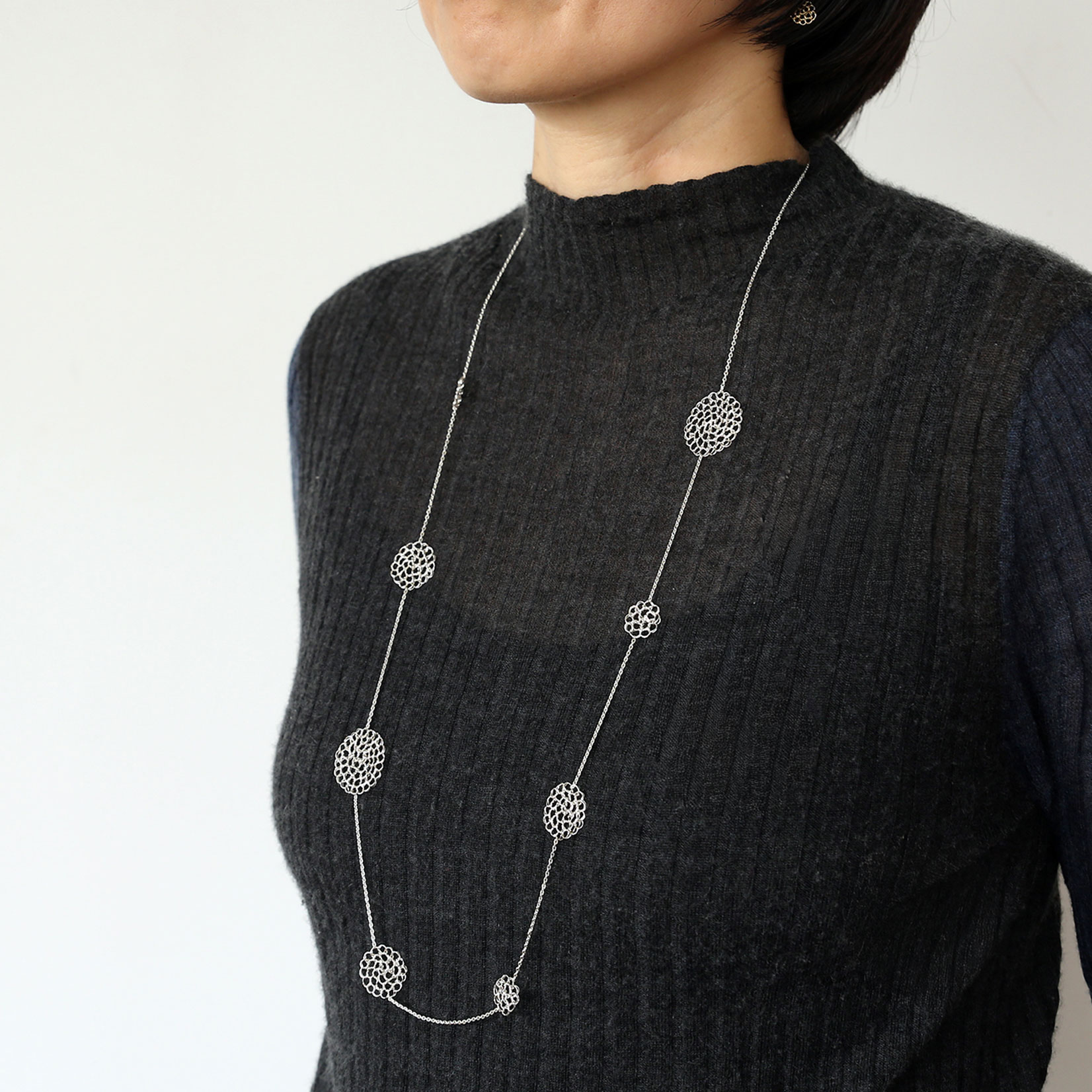 細いメタルワイヤーで編み上げた円形モチーフが、リズムよく連なるネックレス。ひとつひとつのモチーフが光を受けてやわらかく反射し、まるで小さな光の粒が連なっているかのような輝きを放ちます。