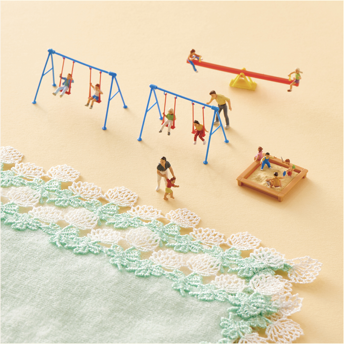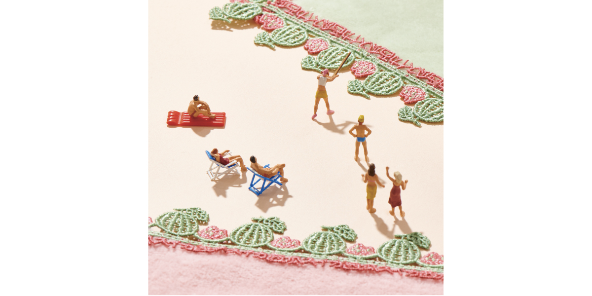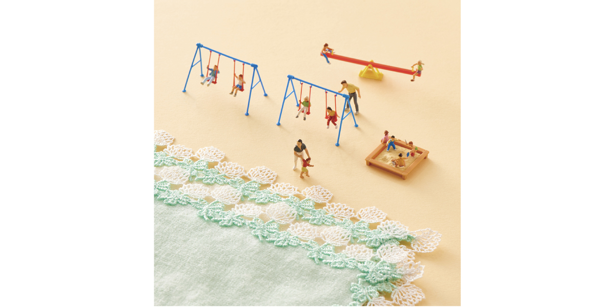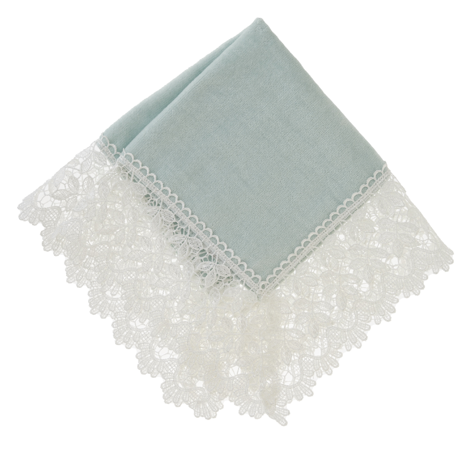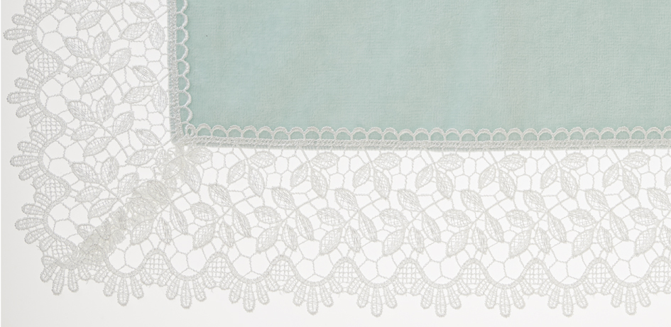 爽やかなグリーンのタオル地と合わせたのは、葉っぱが茂るリーフ柄レース。甘すぎないレースのデザインのため、カジュアルなお洋服にも、この膝掛けハンカチをふわりとかけて。お届け予定の6月に、夏が待ち遠しくなるようなハンカチです。