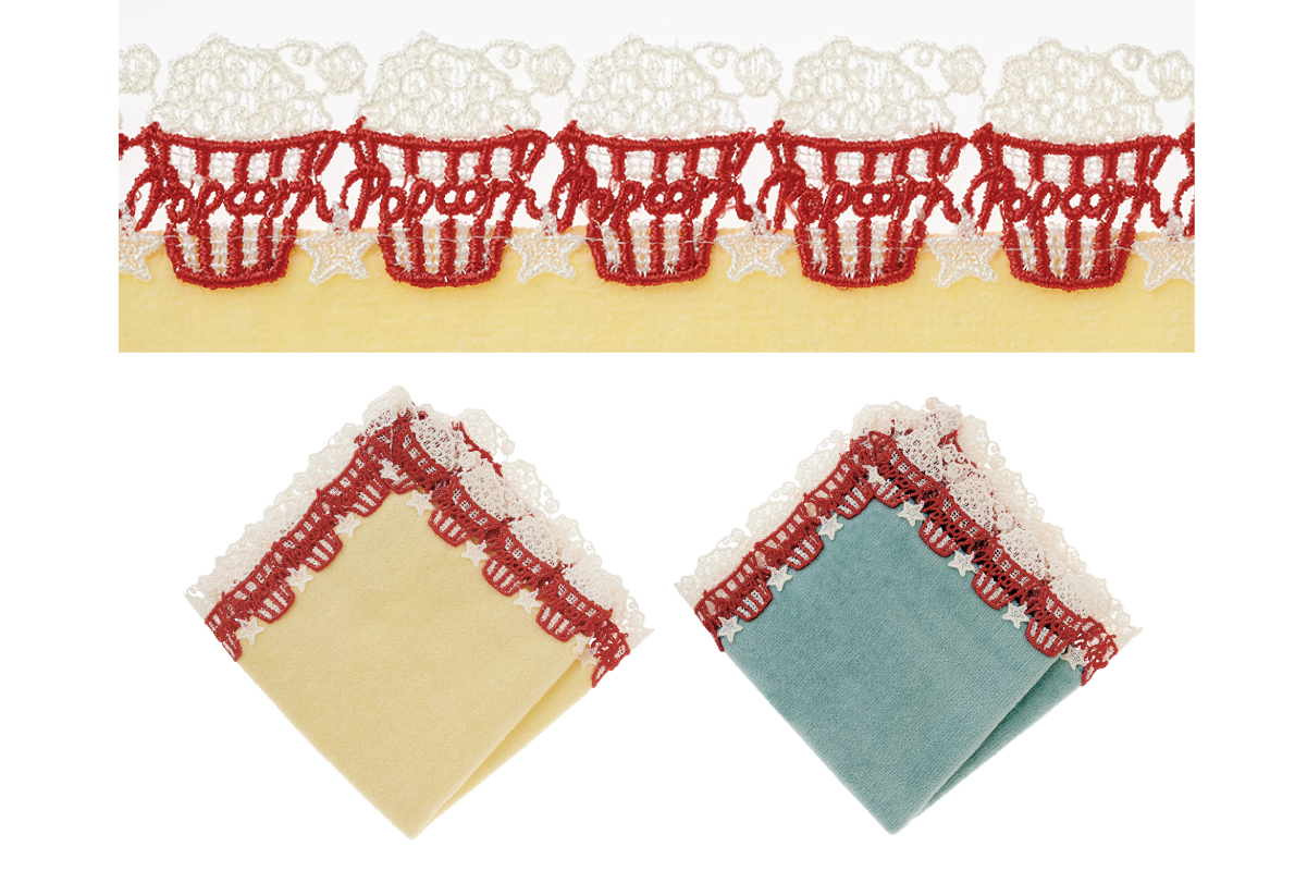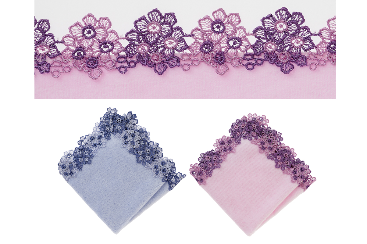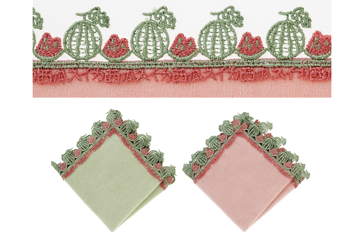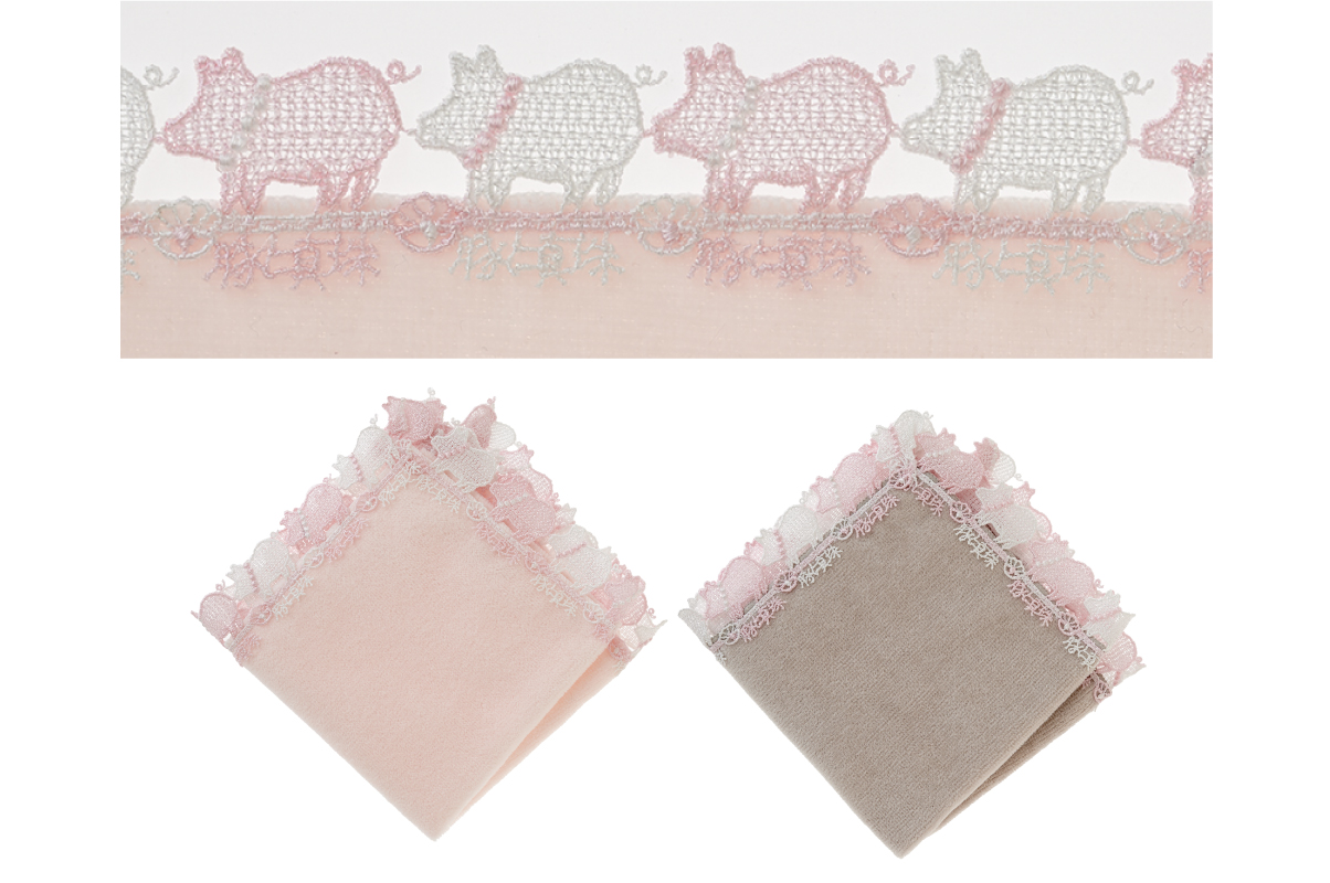 時にエレガントに、時にユーモラスに。シーズンタオルハンカチは、全て当店のデザイナーが心を込めてデザインした、オリジナルのレースを使っています。