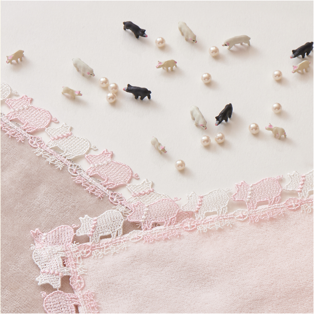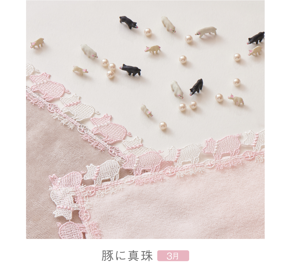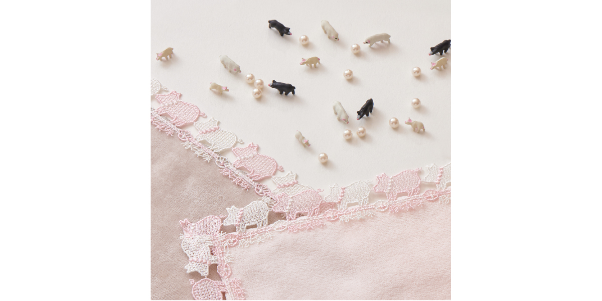 22AWコレクションの「猫に小判」に続く、ことわざレース第2弾!「豚に真珠」とは…「貴重なものも、価値のわからない者には無意味である」ことのたとえ。真珠のネックレスをつけた、キュートな豚さんが茶目っ気たっぷりの1枚です。レースは優しいピンクとパール調のホワイトにしました。親しい間柄のお友達に、楽しいプレゼントを贈ってみませんか?