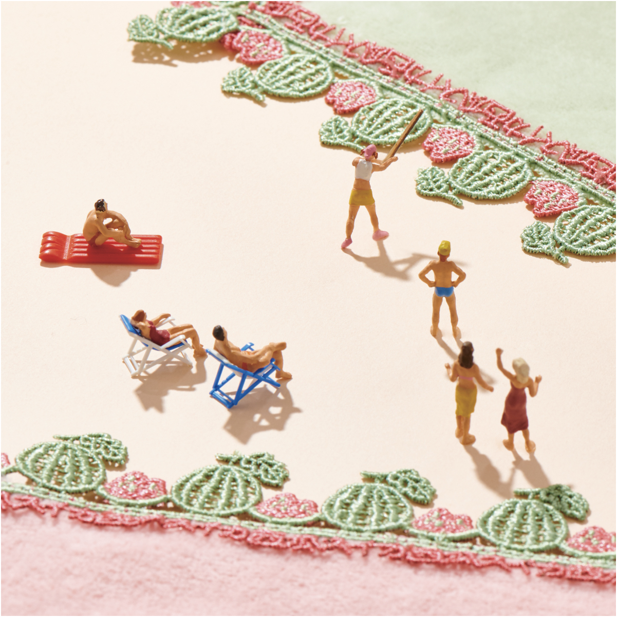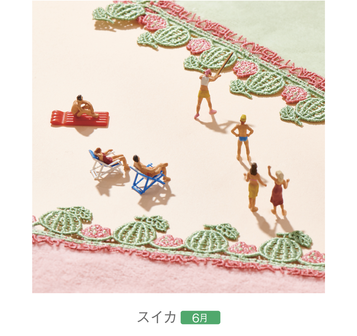 スイカがスーパーに並ぶと夏が来たな~と感じます。カットした△のとんがり、甘くてみずみずしいところをガブリ。ひと口目の多幸感を思い出しながらレースをデザインしました。レースには「スイカ」と「西瓜」の文字が。遊び心たっぷりのハンカチです。甘くておいしいところ、全部かじってしまって・・・すみません。