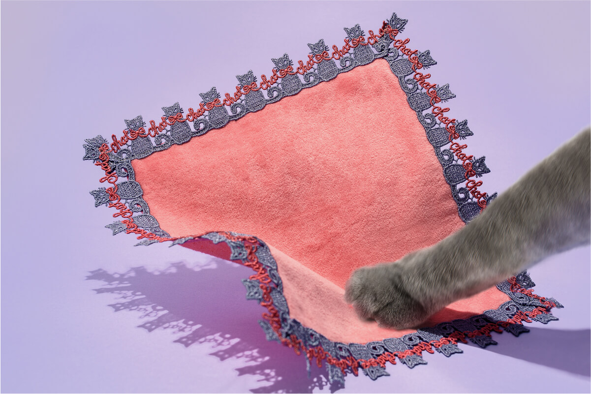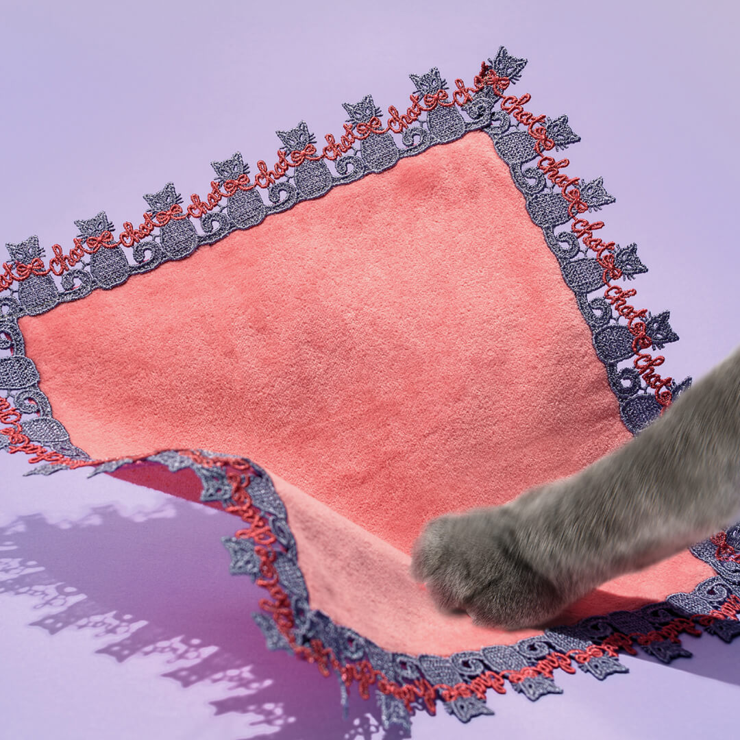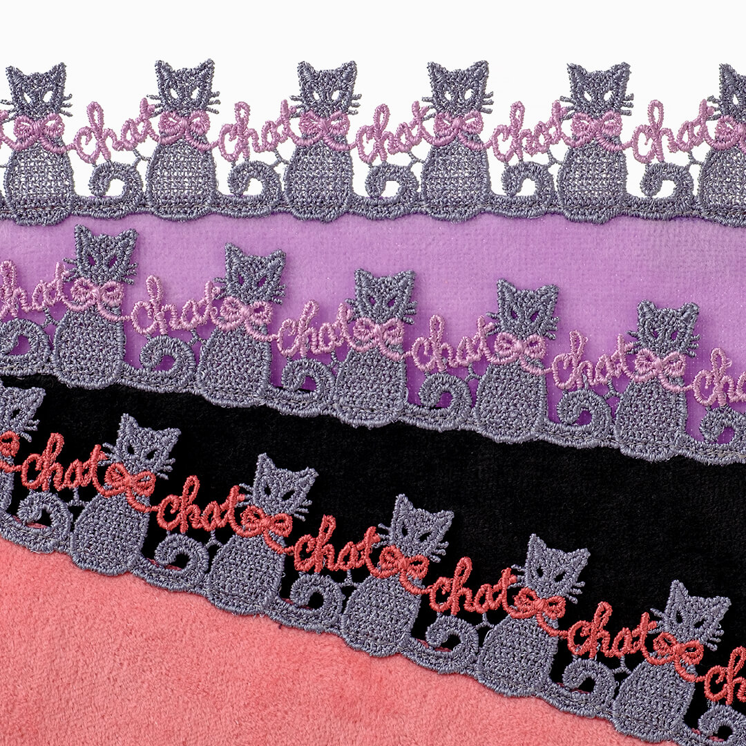 すらりとした体躯と、しっとりとしたグレーの毛並みが優美な猫さん。レッドとピンクの可愛らしいリボンをつけながらも、キリッとスタイリッシュなパリジェンヌ気取りのおすましさんです。リボンで描かれている「chat」は、フランス語で「猫」という意味。ちょっと大人なカラーリングです。