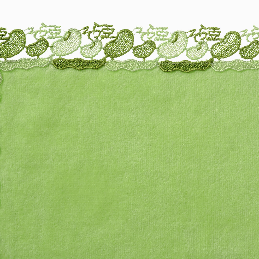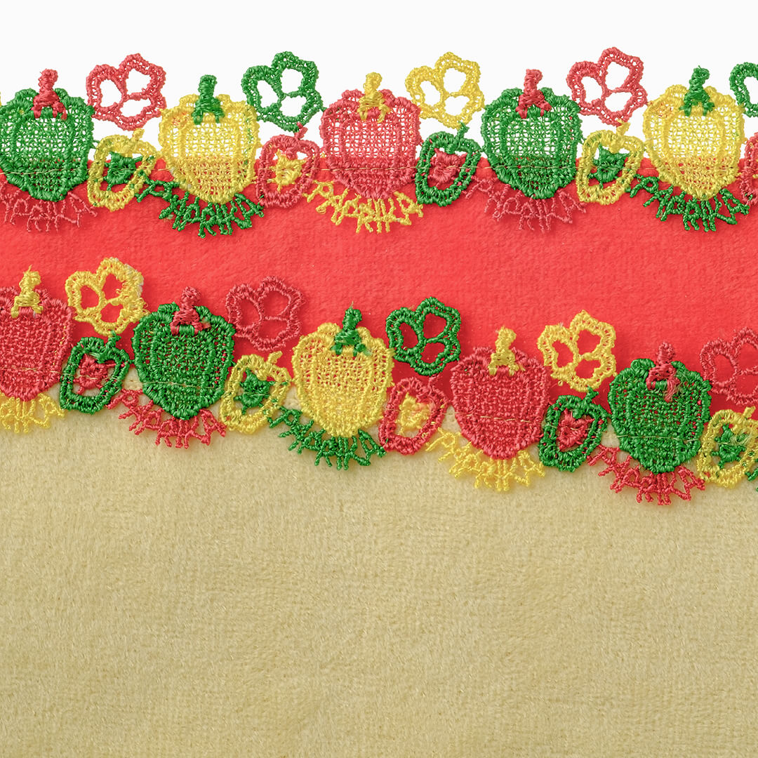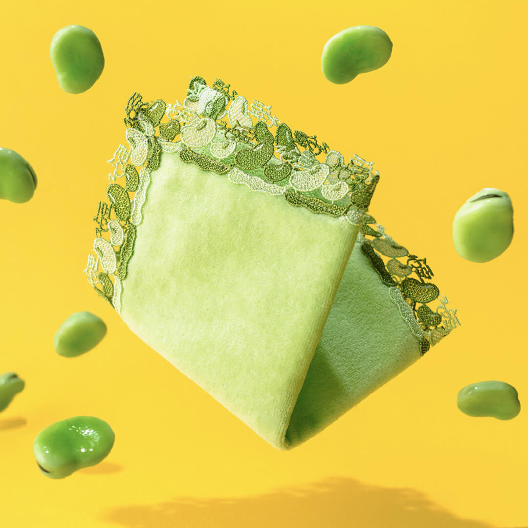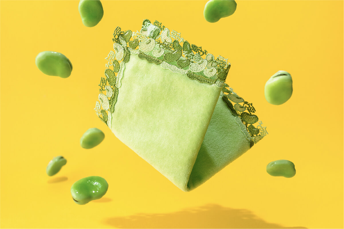 5月~6月に収穫時期を迎える、初夏を代表する野菜です。さやが空に向かって伸びる姿から「そら豆」と呼ばれるようになったのだそう。ピラミッドやトロイの遺跡からも化石が見つかっていて、世界最古の農作物の一つと言われています。鮮やかな緑色でふっくらとかわいいフォルムのそら豆、さや、「そら豆」の文字をレースに施しました。