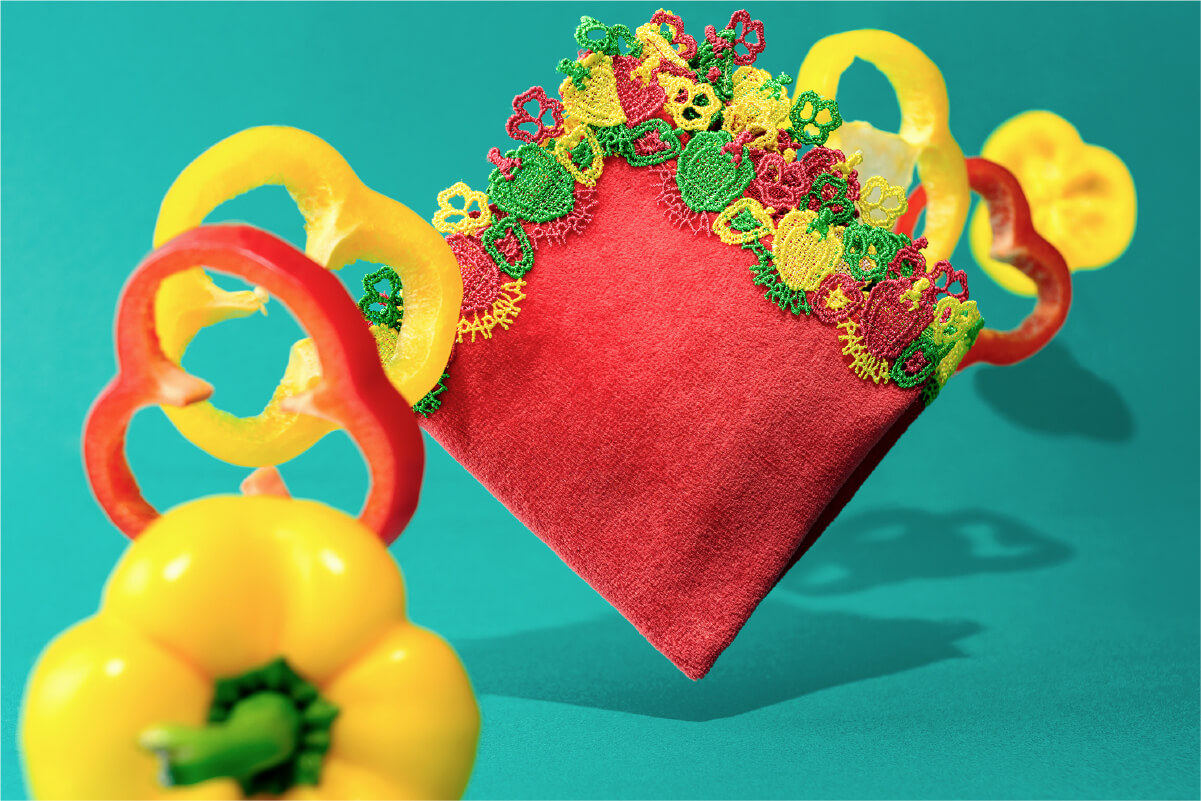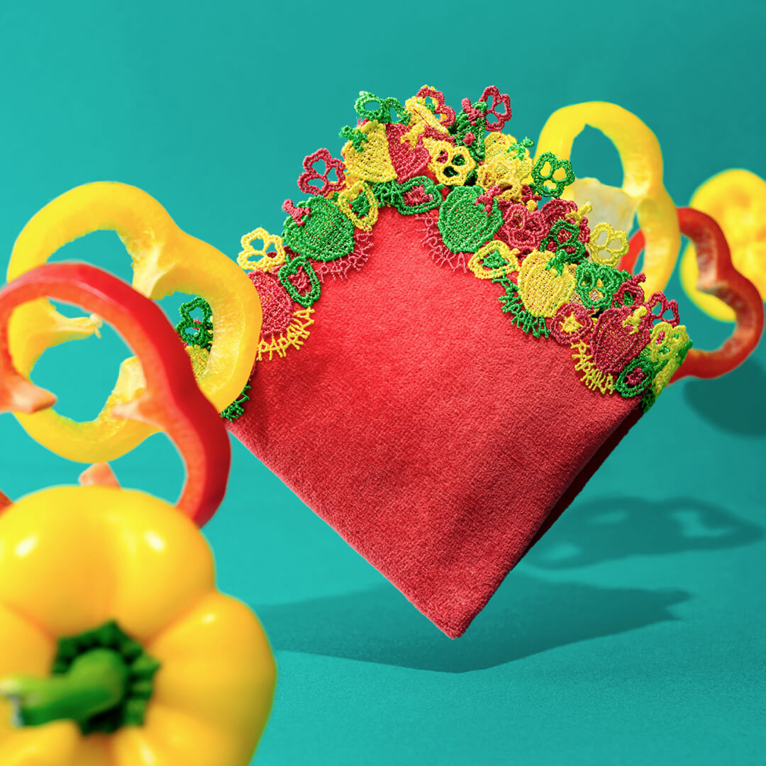 夏の太陽の日差しを浴びた栄養素たっぷりのパプリカは、夏野菜の代表選手。丸まるとしたパプリカのフォルムや断面、そして「PAPRIKA」の文字を繊細に表現。緑のパプリカもあると聞き、赤、黄、緑のカラフルな3色で可愛らしくポップに仕上げました。暑い夏を乗り切るために、ビタミンチャージ!