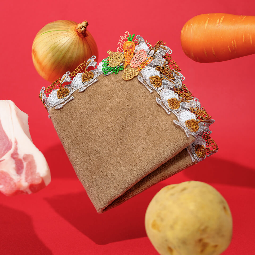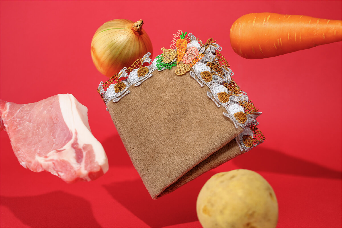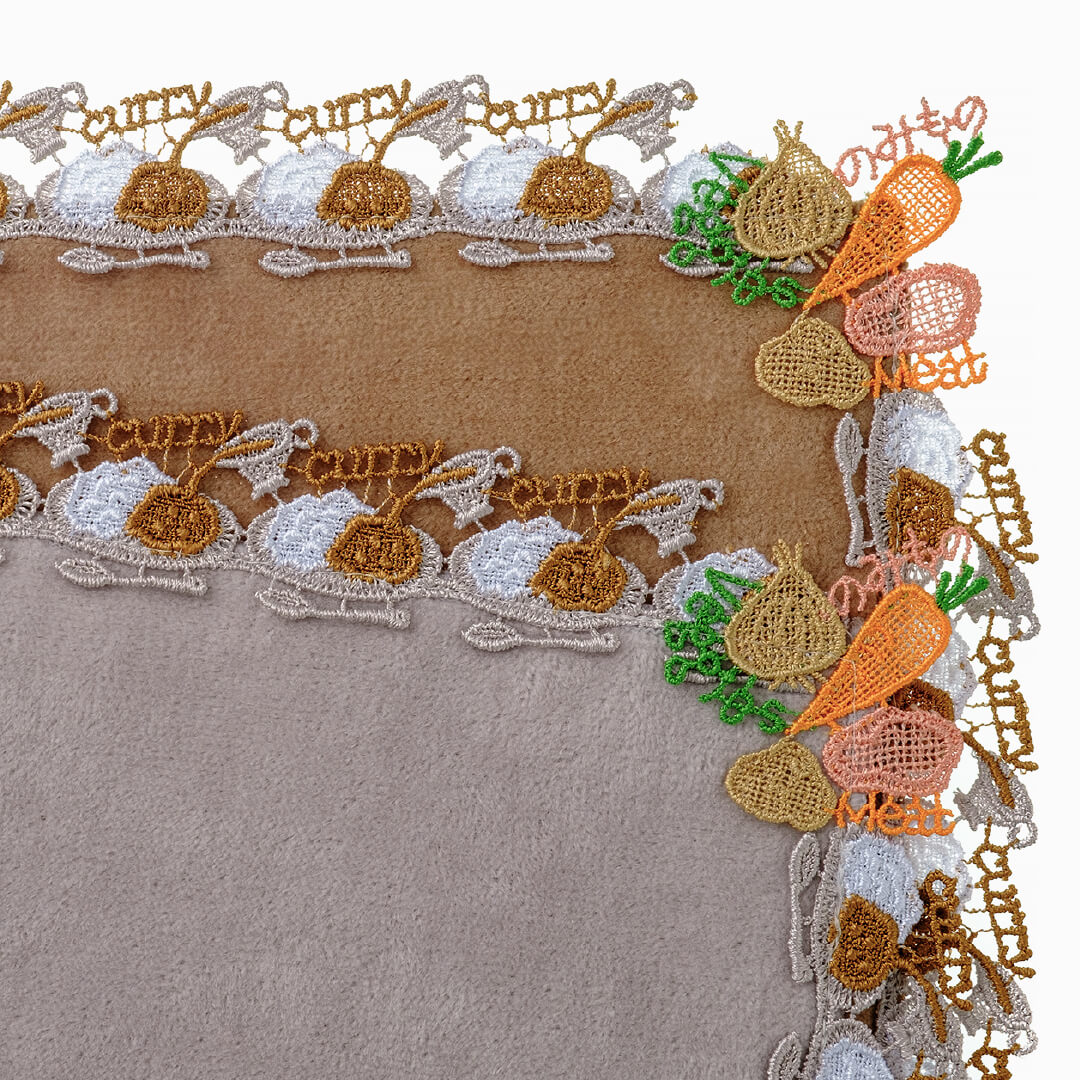 「究極の健康食」とも称されるカレー。定番具材の豚肉、玉ねぎ、にんじん、ジャガイモをモチーフレースで表現。さらに「Veggies」「Meat」「のみもの(カレーは飲み物という意)」の文字を添えました。プレートにのった白いご飯に、トロトロのカレーが注がれています。今にも美味しそうなカレーの香りが漂ってきそう。スプーンをご用意しましたので、さあ召し上がれ!