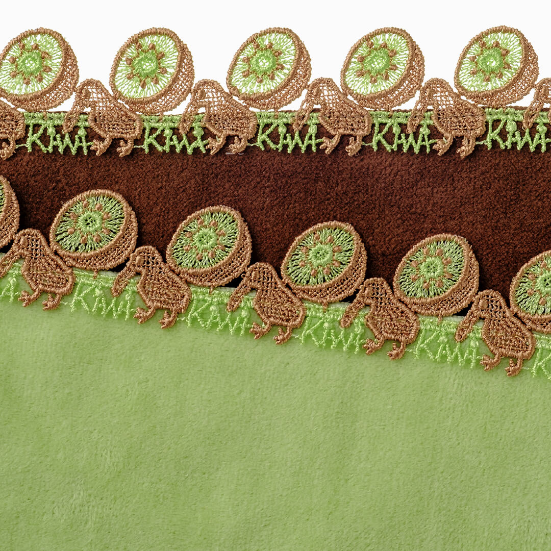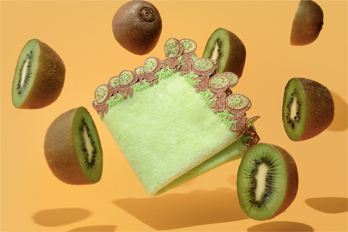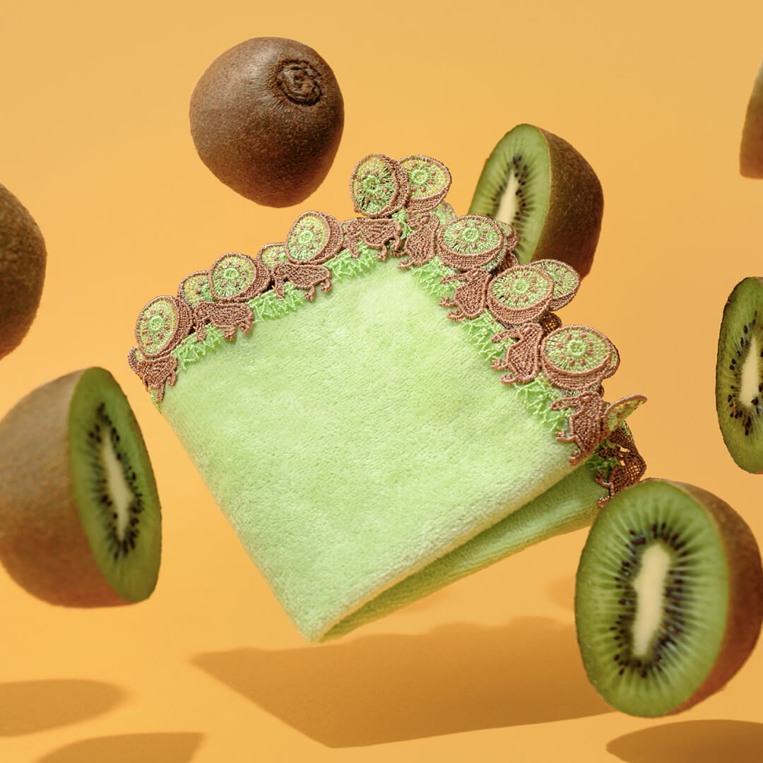 ビタミンCをたっぷり含むキウイは、ニュージーランドの代表的なフルーツです。また「キーウィ」といえばニュージーランドの国鳥で、天敵のいない環境に適応したことで翼が退化し、飛ばない鳥としても有名です。種まで細やかに表現された「キウイ」のフレッシュな断面と、長い嘴と丸い体型で、地面をトコトコ歩く姿がとても愛らしい「キーウィ」。グリーンとブラウンの元気なコントラストが楽しい、ユーモラスなハンカチです。