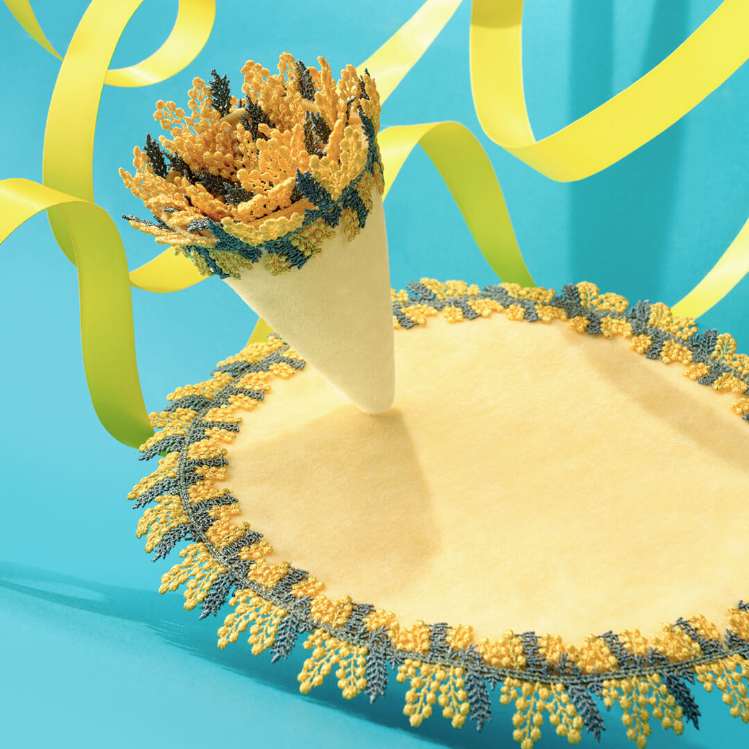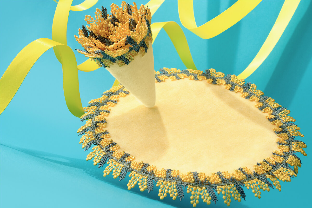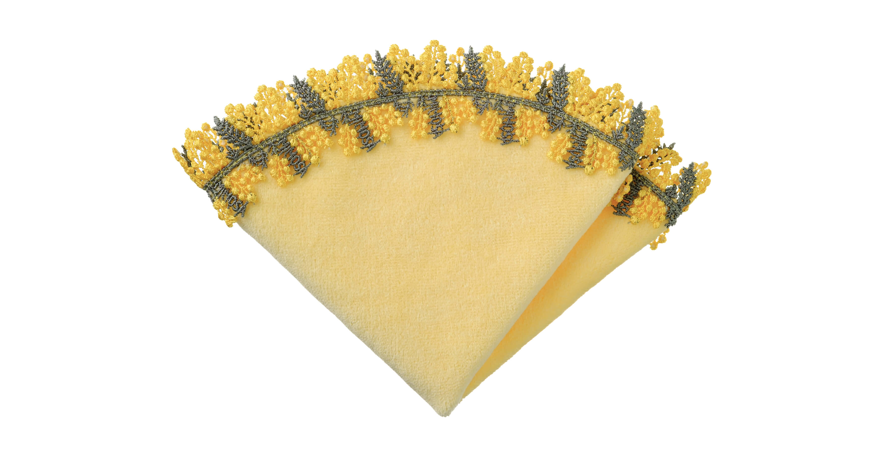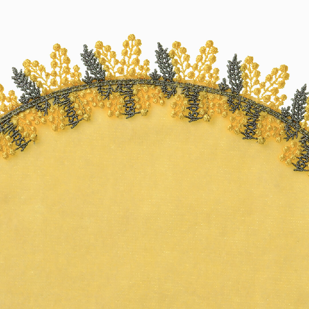 ミモザレース第3弾!今回はサークルハンカチが登場。春の訪れを告げる人気のお花。ふわふわの小さな黄色いお花がとても愛らしい。3月8日は「国際女性デー」。イタリアでは「ミモザの日」と呼ばれ、ミモザの花言葉である「感謝」の意を込めて、男性が女性にミモザの花を贈ります。レースにはMimosaの文字がさりげなく入っていて、クルッと畳むと、まるでミモザのブーケのよう。