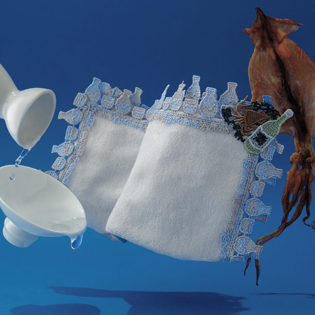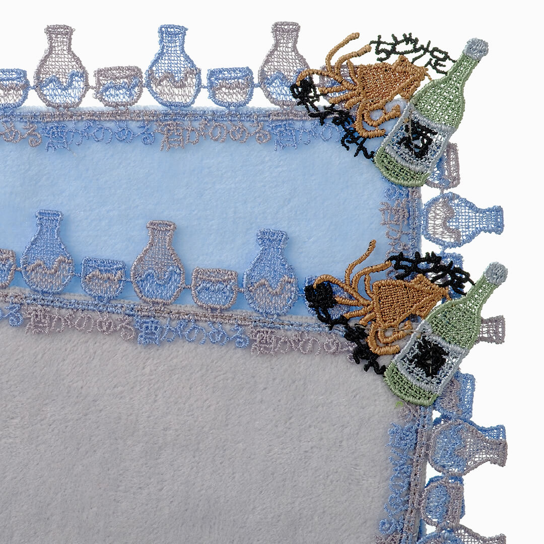 新たなお酒のシリーズとして、日本酒が 登場。徳利とお猪口、そして「酒がのめる」の文字を繊細に表現しています。モチーフレースのするめと一升瓶に添えられているのは、「ちどり足」「酔ってません」の文字。くーっ!うまいっ!という声が聞こえてきそう。