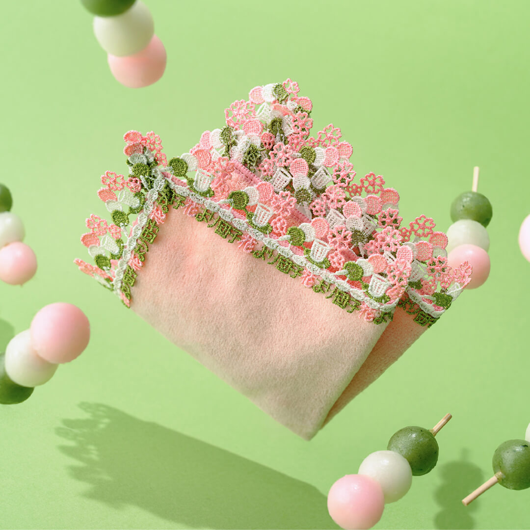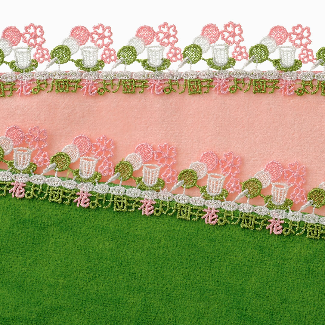 ことわざシリーズ第6弾!「風流より実利のほうをとること。外観よりも実質を尊ぶことのたとえ。」丸いフォルムとカラフルさが可愛らしい三色団子、お茶、お花、そして「花より団子」の文字をレースに施しました。陽気に満ちた暖かい春、おいしい団子を頬張ればさらに会話が弾みそう。