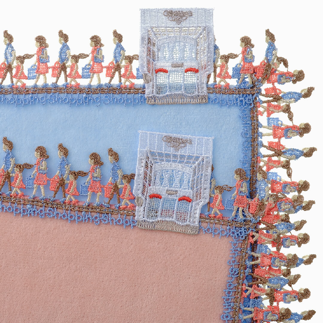 近沢レース店へようこそ!本店を構える元町通りは、ゆっくりとお買い物が楽しめるショッピングストリート。モチーフレースは、近沢レース店本店のエントランスです。お買い物を楽しむお客様を表現した、愉快なデザイン。横浜にいらした際には、是非本店に遊びにいらしてください。